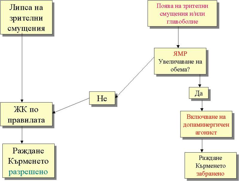 С установяването на бременността допаминергичния агонист трябва да бъде спрян.Проследяването на концентрациите на пролактин не носи никаква информация и е излишно-няма връзка между нивата на пролактина и обема на тумора.Поради ниската честота на увеличаване на обема на микроаденома по време на бременността не се препоръчва систематичното проследяване на зрителните полета.Анализът на зрителните полета и образната диагносктика /ЯМР/ се предприемат при клинична изява /главоболие,смущения във виждането/.Разбира се при поява на зрителни смущения и констатирано увеличение на обема на тумора с ЯМР /той може да бъде направен след 3 лунарен месец и при избягване на прилагане на gadolinium / е уместно за се започне лечение с бромокриптин /2-4,9,10/.